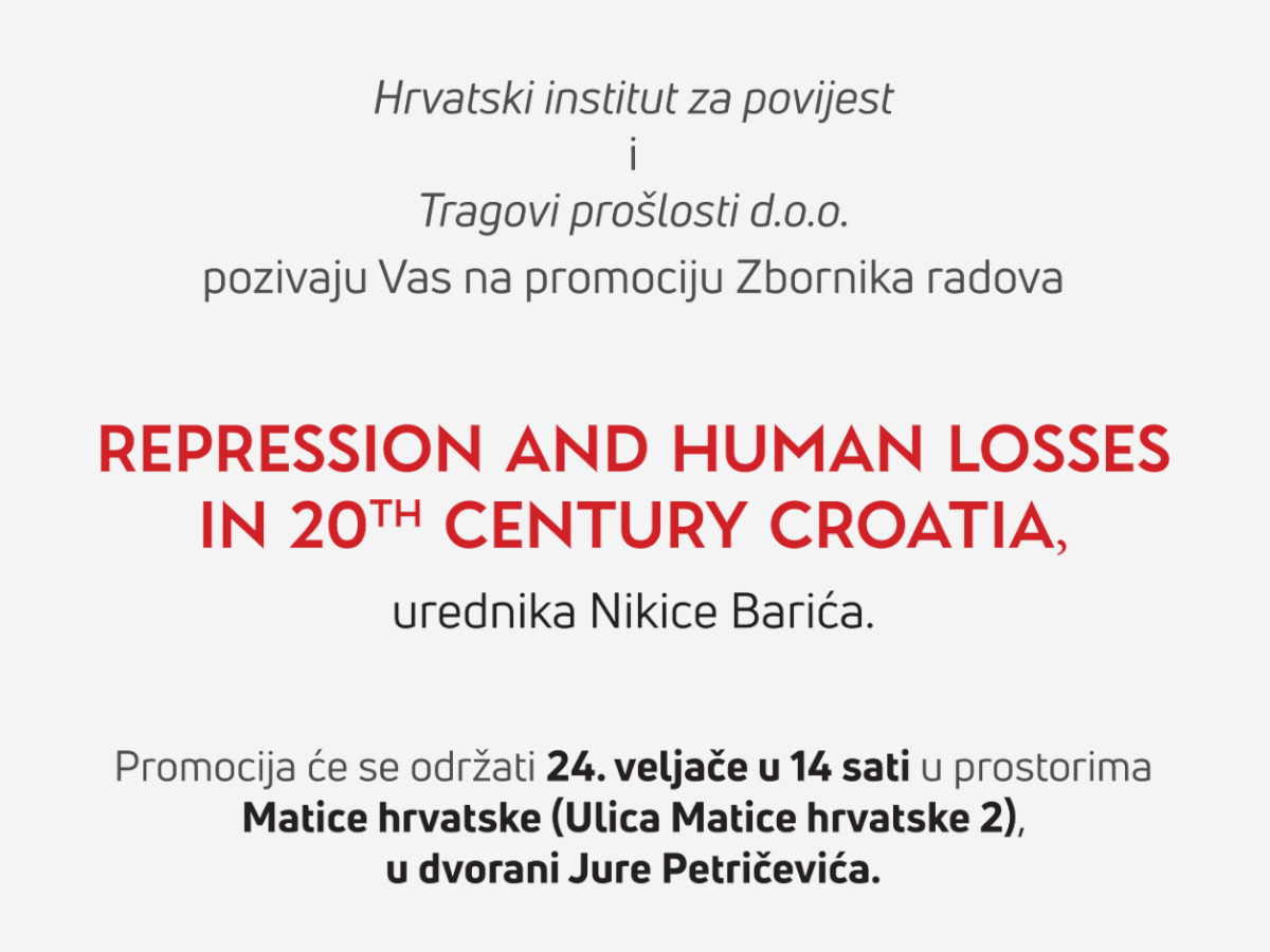Hrvatski institut za povijest i Tragovi prošlosti pozivaju Vas na promociju zbornika Repression and Human Losses in 20th Century Croatia24. veljače u 14 sati u prostorima Matice hrvatske.